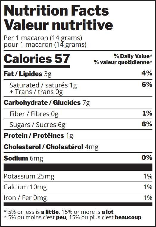Ingredients: Sugars (icing sugar (sugar, corn starch), sugar, candy cane (cane sugar, corn syrup, peppermint oil, colour: allura red)) • Almond flour • Egg whites • Butter • White chocolate (cocoa butter, sugar, whole milk powder, milk fat emulsifer, soy lecithin, natural vanilla flavouring) • White chocolate (sugar, cocoa butter, whole milk powder, soy lecithin, natural vanilla flavour) • Green colour(anthocyanins, turmeric, baking soda, glycerin)