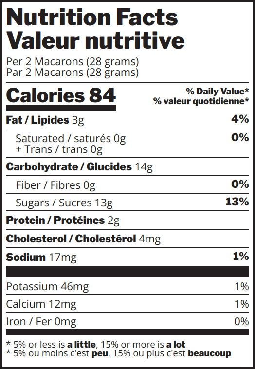 Ingredients: Sugars (sugar, icing sugar (sugar, corn starch)) • egg whites • almonds • lemon juice • white chocolate (sugar, cocoa butter, whole milk powder, soy lecithin, natural vanilla flavour) • water • egg yolks (egg yolks, sugar) • butter • carotene • cream of tartar • sea salt