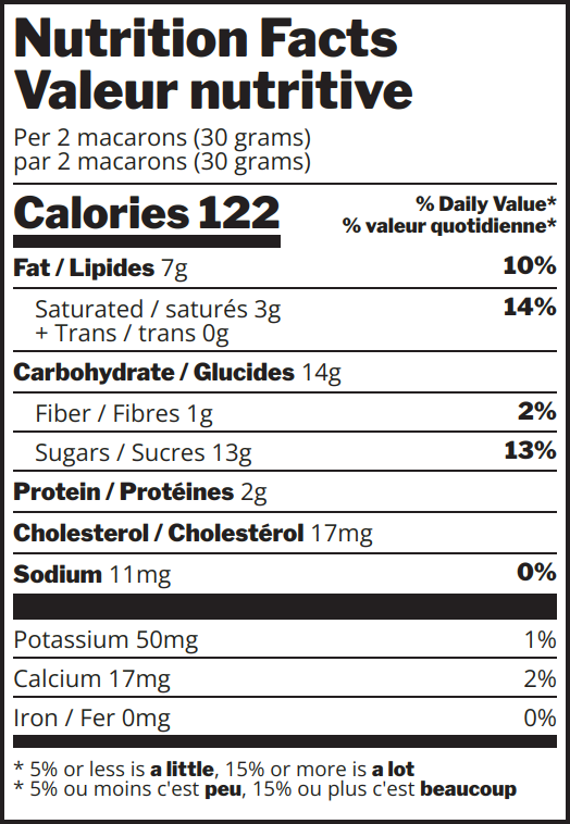 Ingredients: Sugars (sugar, icing sugar (sugar, corn starch)) • almonds • butter • liquid egg white • pink guava puree(pink guavas, cane sugar, malic acid) • white chocolate (cocoa butter, sugar, whole milk powder, milk fat emulsifer, soy lecithin, natural vanilla flavouring) • egg yolks (egg yolks, sugar) • water • lemon juice • cochineal • egg white powder(egg white, citric acid, baker’s yeast) • citric acid • green colour(anthocyanins, turmeric, baking soda, glycerin)