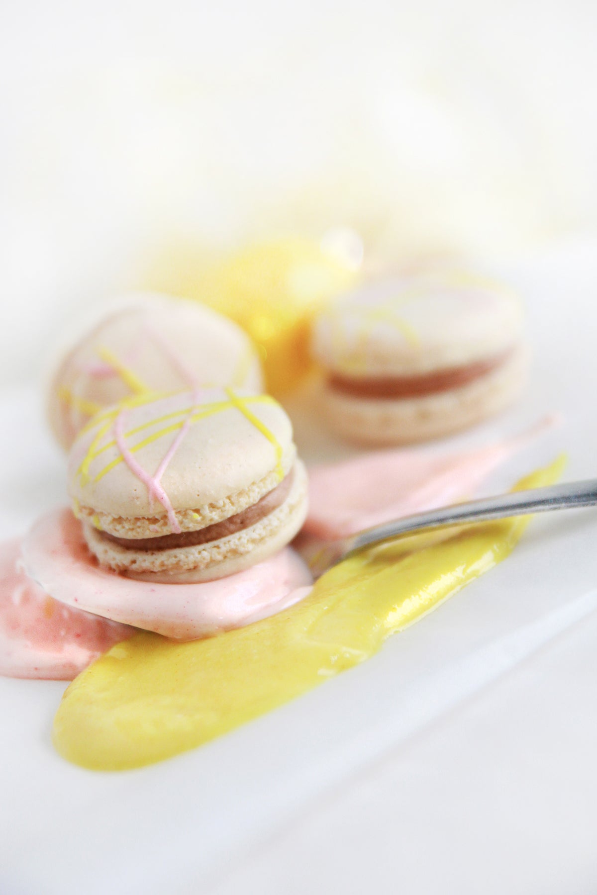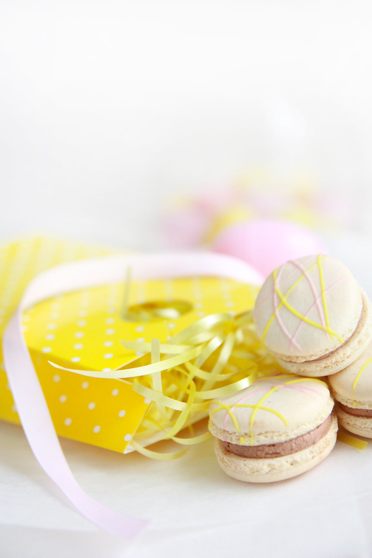 Ingredients: Sugars (icing sugar (sugar, corn starch), sugar) • almonds • egg whites • butter • whole milk • white chocolate (sugar, cocoa butter, whole milk powder, soy lecithin, natural vanilla flavour) • egg yolks (egg yolks, sugar) • water • cocoa powder • corn starch • vanilla extract (filtered water, organic ethyl alcohol, organic vanilla beans) • turmeric • cochineal